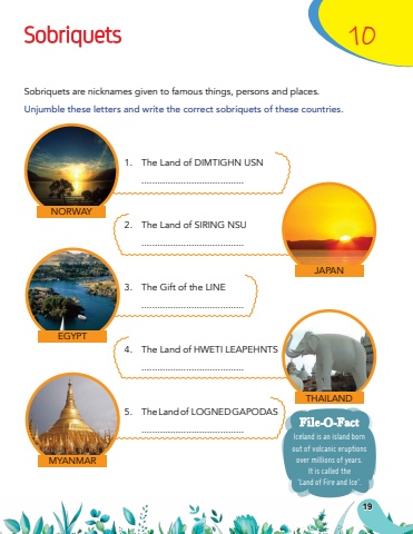 101.The Land of DIMTIGHN USN.......................................2.The Land of SIRING NSU.......................................3.The Gift of the LINE.......................................4.The Land of HWETI LEAPEHNTS.......................................5.The Land of LOGNED GAPODAS .......................................SobriquetsSobriquets are nicknames given to famous things, persons and places.Unjumble these letters and write the correct sobriquets of these countries.NORWAYJAPANTHAILANDEGYPTMYANMARIceland is an island born out of volcanic eruptions over millions of years. It is called the %u2018Land of Fire and Ice%u2019.File-O-Fact19