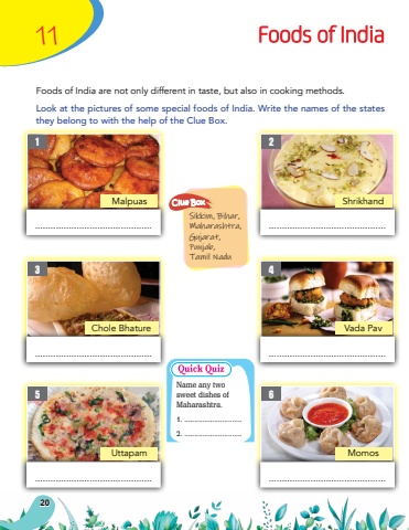 Name any two sweet dishes of Maharashtra.1. .............................2. .............................11Foods of IndiaFoods of India are not only different in taste, but also in cooking methods.Look at the pictures of some special foods of India. Write the names of the states they belong to with the help of the Clue Box...............................................................................................................................................................................................................................................................................135246MalpuasChole BhatureUttapamShrikhandVada PavMomosSikkim, Bihar, Maharashtra, Gujarat, Punjab, Tamil NaduClue Box20