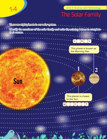 This planet is closest to the Sun.This planet is known as the Morning Star.MCYVNS12SunThere are eight planets in our solar system.Identify the members of the solar family and write the missing letters to complete their names.The Solar Family14Unit 3: Science and Technology26