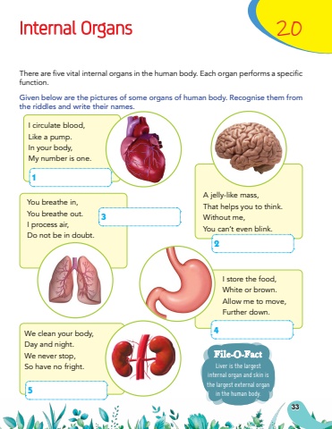 Internal Organs20Liver is the largest internal organ and skin is the largest external organ in the human body.File-O-FactThere are five vital internal organs in the human body. Each organ performs a specific function.Given below are the pictures of some organs of human body. Recognise them from the riddles and write their names.I circulate blood,Like a pump.In your body,My number is one.We clean your body,Day and night.We never stop,So have no fright.A jelly-like mass,That helps you to think.Without me,You can%u2019t even blink.You breathe in,You breathe out.I process air,Do not be in doubt.I store the food,White or brown.Allow me to move,Further down. 2 3 5 4 133