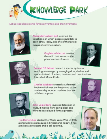 Tim Berners-Lee started the World Wide Web in 1989 along with his colleagues in Switzerland. Today, it has a million active users and is still growing. Let us read about some famous inventors and their inventions.Alexander Graham Bell invented the telephone on which people could talk to each other. Today, it is one of the fastest means of communication.Guglielmo Marconi invented the radio that works on the phenomenon of waves.Samuel F.B. Morse created a special system of sending a message by arranging dots, dashes and spaces instead of letters, numbers and punctuations. It is called Morse Code.Charles Babbage created a Difference Engine which was the beginning of the modern-day wonder machine that we call the computer.John Logie Baird invented television in 1926. It moved from being black and white to its coloured form at present.34
