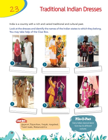 23Every Indian classical dance form has its different costume.File-O-FactTraditional Indian DressesIndia is a country with a rich and varied traditional and cultural past. Look at the dresses and identify the names of the Indian states to which they belong. You may take help of the Clue Box.Gujarat, Rajasthan, Punjab, Nagaland, Tamil Nadu, MaharashtraClue Box....................................................................................................................................................................................................................................14253638