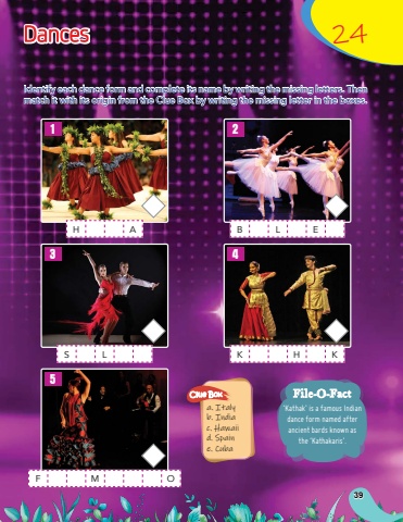 DancesIdentify each dance form and complete its name by writing the missing letters. Then match it with its origin from the Clue Box by writing the missing letter in the boxes.H AB L E1S L35K H K4224a. Italyb. Indiac. Hawaiid. Spaine. CubaClue Box%u2018Kathak%u2019 is a famous Indian dance form named after ancient bards known as the %u2018Kathakaris%u2019.File-O-FactF M O39