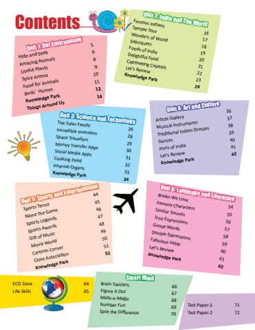 ContentsHide and Seek5Amazing Animals6UsefulPlants%u00098Spicy Aroma9Food for Animals10Birds' Homes11Knowledge Park12Things Around Us14Unit 1: Our EnvironmentFamous Indians16Temple Tour17Wonders of World18Sobriquets19Foods of India20DelightfulFood%u000921CaptivatingCapitals%u000922Let's Review23Knowledge Park24Unit 2: India and The WorldThe Solar FamilyIncr26edible InventorsSpace T28ravellersMone29y Transfer AppsSocial Media App30sCooking F31oodInternal Or32gansKnowledg33e Park34Unit 3: Science and TechnologySports Terms44Name the Game45Sports Legends46Sports Awards47GiftofMusic%u000948Movie World49Cartoon Corner50CloseAssociation%u000951Knowledge Park52Unit 5: Sports and EntertainmentUnit 5: Sports and EntertainmentBooks We Love54Famous Characters55Similar Sounds56TrueExpressions%u000957Group Words58DoubleExpressions%u000959Fabulous Fable60Let's Review61Knowledge Park62Unit 6: Language and LiteratureArtistsGallery%u000936Musical Instruments37TraditionalIndianDresses%u000938Dances39Forts of India40Let's Review41Knowledge Park42Unit 4: Art and CultureUnit 4: Art and CultureBrain Twisters66Figure it Out67Math-e-Magic68Number Fun69SpottheDifference%u000970Smart MindECO Zone64Life Skills65TestPaper-1%u0009 71TestPaper-2%u0009 72