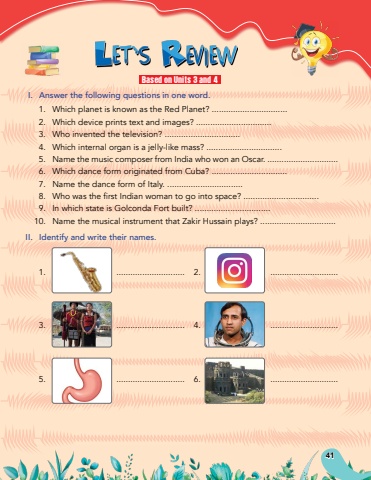 I.Answer the following questions in one word.1.Which planet is known as the Red Planet? ................................2.Which device prints text and images? ................................3.Who invented the television? ................................4.Which internal organ is a jelly-like mass? ................................5.Name the music composer from India who won an Oscar. ..............................6.Which dance form originated from Cuba? ................................7.Name the dance form of Italy. ................................8.Who was the first Indian woman to go into space? ................................9.In which state is Golconda Fort built? ................................10.Name the musical instrument that Zakir Hussain plays? ................................II.Identify and write their names.1..............................2..............................3..............................4..............................5..............................6..............................Based on Units 3 and 441