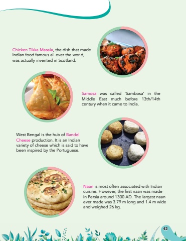 Chicken Tikka Masala, the dish that made Indian food famous all over the world, was actually invented in Scotland.Samosa was called %u2018Sambosa%u2019 in the Middle East much before 13th/14th century when it came to India.West Bengal is the hub of Bandel Cheese production. It is an Indian variety of cheese which is said to have been inspired by the Portuguese.Naan is most often associated with Indian cuisine. However, the first naan was made in Persia around 1300 AD. The largest naan ever made was 3.79 m long and 1.4 m wide and weighed 26 kg.43