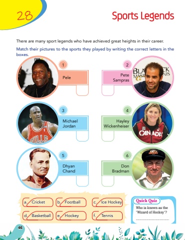 28Sports LegendsThere are many sport legends who have achieved great heights in their career.Match their pictures to the sports they played by writing the correct letters in the boxes.3 4Michael JordanHayley Wickenheiser5 6Dhyan ChandDon Bradman1 2PelePete Samprasa. Cricketc. Ice Hockeyf. Tennisb. Footballd. Basketballe. HockeyWho is known as the %u2018Wizard of Hockey%u2019?.....................................46