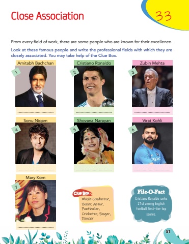Close AssociationFrom every field of work, there are some people who are known for their excellence.Look at these famous people and write the professional fields with which they are closely associated. You may take help of the Clue Box.Amitabh Bachchan..............................1Mary Kom..............................7Cristiano Ronaldo..............................2Zubin Mehta..............................3Sonu Nigam..............................4Shovana Narayan..............................5Virat Kohli..............................633Music Conductor, Boxer, Actor, Footballer, Cricketer, Singer, DancerClue BoxCristiano Ronaldo ranks 21st among English football first-tier top scores.File-O-Fact51