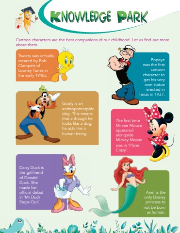 Ariel is the only Disney princess to not be born as human.The first time Minnie Mouse appeared alongside Mickey Mouse was in %u2018Plane Crazy%u2019.Popeye was the first cartoon character to get his very own statue erected in Texas in 1937.Tweety was actually created by Bob Clampett of Looney Tunes in the early 1940s.Goofy is an anthropomorphic dog. This means that although he looks like a dog, he acts like a human being.Daisy Duck is the girlfriend of Donald Duck. She made her official debut in %u2018Mr Duck Steps Out%u2019.Cartoon characters are the best companions of our childhood. Let us find out more about them.62