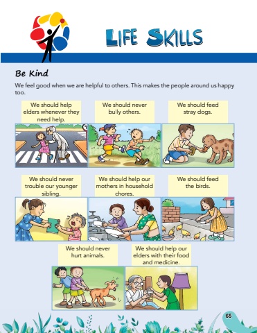 We should help elders whenever they need help.We should never trouble our younger sibling.We should never bully others.We should help our mothers in household chores.We should never hurt animals.We should help our elders with their food and medicine.We should feed stray dogs.We should feed the birds.We feel good when we are helpful to others. This makes the people around us happy too. Be Kind65