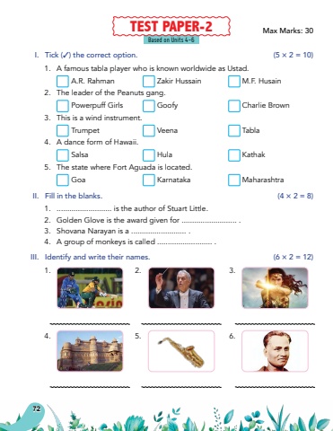 Based on Units 4-6I.Tick (%uf033) the correct option.(5 %u00d7 2 = 10)1.A famous tabla player who is known worldwide as Ustad.A.R. RahmanZakir HussainM.F. Husain2.The leader of the Peanuts gang.Powerpuff GirlsGoofyCharlie Brown3.This is a wind instrument.TrumpetVeenaTabla4.A dance form of Hawaii.SalsaHulaKathak5.The state where Fort Aguada is located.GoaKarnatakaMaharashtraII.Fill in the blanks.(4 %u00d7 2 = 8)1........................... is the author of Stuart Little.2.Golden Glove is the award given for .......................... .3.Shovana Narayan is a .......................... .4.A group of monkeys is called .......................... .III.Identify and write their names.(6 %u00d7 2 = 12)1.2.3.4.5.6.TEST PAPER-2Max Marks: 3072