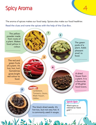 4Cardamom, Turmeric, Cloves, Black Pepper, ChilliesClue BoxSpicy AromaThe aroma of spices makes our food tasty. Spices also make our food healthier.Read the clues and name the spices with the help of the Clue Box.The yellowpowder made from roots of a plant. Makes food yellow in colour.........................The red and green fruits of a plant. It%u2019s hot, hot, hot! Sometimes gives bright red colour to food. ....................The black dried seeds. It%u2019s hot too, but not very hot. It is commonly used in soups. ........................The green pods of a plant. Adds pleasant smell to food.....................A dried flower from a plant. It is a favourite of Mughlai food lovers...................12345Which spice is referred as %u2018black gold%u2019?.......................................9
