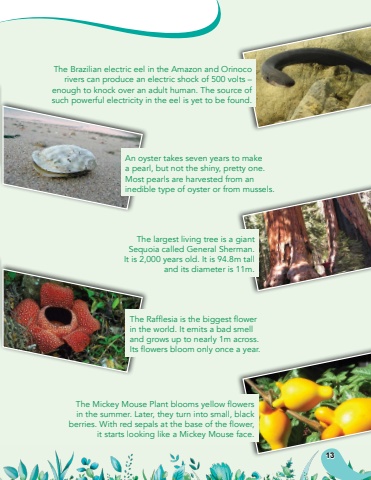 An oyster takes seven years to make a pearl, but not the shiny, pretty one. Most pearls are harvested from an inedible type of oyster or from mussels.The Brazilian electric eel in the Amazon and Orinoco rivers can produce an electric shock of 500 volts %u2013 enough to knock over an adult human. The source of such powerful electricity in the eel is yet to be found.The Rafflesia is the biggest flower in the world. It emits a bad smell and grows up to nearly 1m across. Its flowers bloom only once a year.The largest living tree is a giant Sequoia called General Sherman. It is 2,000 years old. It is 94.8m tall and its diameter is 11m.The Mickey Mouse Plant blooms yellow flowers in the summer. Later, they turn into small, black berries. With red sepals at the base of the flower, it starts looking like a Mickey Mouse face.13