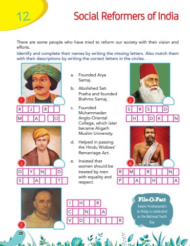 12Social Reformers of Indiaa.Founded Arya Samaj.b.Abolished Sati Pratha and founded Brahmo Samaj. c.Founded Muhammadan Anglo-Oriental College, which later became Aligarh Muslim University.d.Helped in passing the Hindu Widows%u2019 Remarriage Act. e.Insisted that women should be treated by men with equality and respect.There are some people who have tried to reform our society with their vision and efforts.Identify and complete their names by writing the missing letters. Also match them with their descriptions by writing the correct letters in the circles.Swami Vivekananda%u2019s birthday is celebrated as the National Youth Day.File-O-FactD Y N DSRSDH DK NI H RC N AV DSRR M R NSA TP A H AM AOR JR1324520