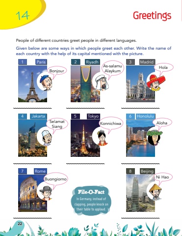 RiyadhMadridJakartaTokyoHonoluluRomeBeijingPeople of different countries greet people in different languages.Given below are some ways in which people greet each other. Write the name of each country with the help of its capital mentioned with the picture.GreetingsNi Hao 14Hola As-salamu AlaykumKonnichiwa Selamat SiangAloha Bonjour Buongiorno 1Paris2475368In Germany, instead of clapping, people knock on their table to applaud.File-O-Fact22