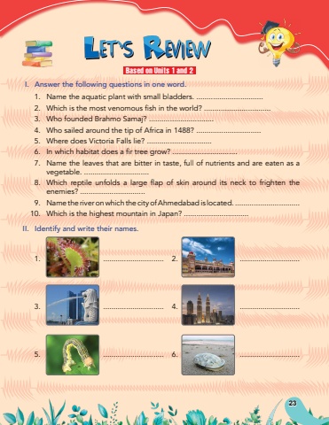 I.Answer the following questions in one word.1.Name the aquatic plant with small bladders. ................................2.Which is the most venomous fish in the world? ................................3.Who founded Brahmo Samaj? ...............................4.Who sailed around the tip of Africa in 1488? ...............................5.Where does Victoria Falls lie? ...............................6.In which habitat does a fir tree grow? ...............................7.Name the leaves that are bitter in taste, full of nutrients and are eaten as a vegetable. ...............................8.Which reptile unfolds a large flap of skin around its neck to frighten the enemies? ...............................9.Name the river on which the city of Ahmedabad is located. ...............................10.Which is the highest mountain in Japan? ...............................II.Identify and write their names.1..............................2..............................3..............................4..............................5..............................6..............................Based on Units 1 and 223