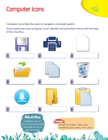 In Windows, there is a shortcut icon on the desktop that enables the user to easily see the data.File-O-FactComputer Icons16Computer icons help the users to navigate a computer system.Given below are some computer icons. Identify and write their names with the help of the Clue Box.147258369Recycle bin, Folder, Open, New, Download, Save, Paste, Print, CopyClue Box27
