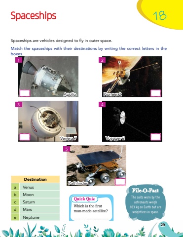 Spaceships18The suits worn by the astronauts weigh 103 kg on Earth but are weightless in space.File-O-FactDestinationa Venusb MooncSaturnd Marse Neptune12345Venera 7Voyager 2PathfinderApolloPioneer 2Spaceships are vehicles designed to fly in outer space.Match the spaceships with their destinations by writing the correct letters in the boxes.Which is the first man-made satellite?....................................29