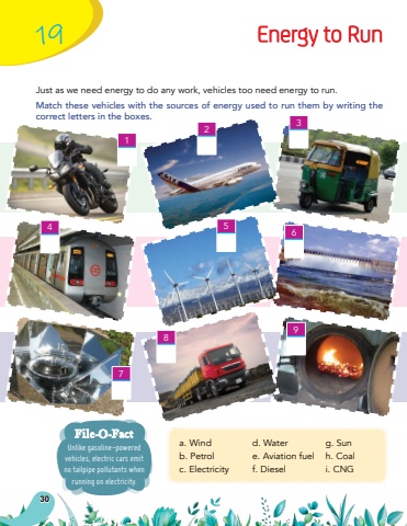 19Energy to RunJust as we need energy to do any work, vehicles too need energy to run.Match these vehicles with the sources of energy used to run them by writing the correct letters in the boxes.147982563Unlike gasoline-powered vehicles, electric cars emit no tailpipe pollutants when running on electricity.File-O-Facta. Windb. Petrolc. Electricityd. Watere. Aviation fuelf. Dieselg. Sunh. Coali. CNG30