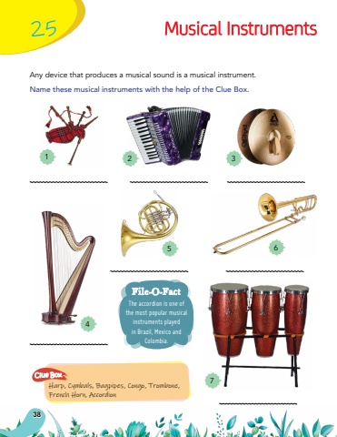 Musical InstrumentsAny device that produces a musical sound is a musical instrument.Name these musical instruments with the help of the Clue Box.Harp, Cymbals, Bagpipes, Congo, Trombone, French Horn, AccordionClue Box251234567The accordion is one of the most popular musical instruments played in Brazil, Mexico and Colombia.File-O-Fact38