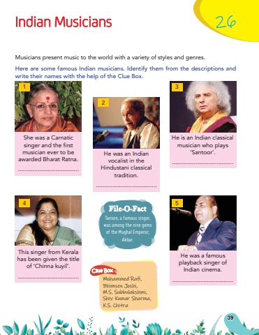 Indian MusiciansMohammed Rafi, Bhimsen Joshi, M.S. Subbulakshmi, Shiv Kumar Sharma, K.S. ChitraClue BoxMusicians present music to the world with a variety of styles and genres.Here are some famous Indian musicians. Identify them from the descriptions and write their names with the help of the Clue Box.Tansen, a famous singer, was among the nine gems of the Mughal Emperor, Akbar.File-O-FactShe was a Carnatic singer and the first musician ever to be awarded Bharat Ratna......................................This singer from Kerala has been given the title of %u2018Chinna kuyil%u2019......................................He was a famous playback singer of Indian cinema......................................He was an Indian vocalist in the Hindustani classical tradition......................................He is an Indian classical musician who plays %u2018Santoor%u2019. .....................................142352639