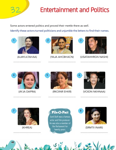 (AJAYLILTAHAA).....................................(YAJA AHCBHACN).....................................(USATAHHRGN NASHI).....................................(AYJA DAPRA).....................................(RKOINR EHKR).....................................(VOIDN NKHNAA).....................................(KHREA).....................................(SRMTII INARI).....................................Entertainment and PoliticsSome actors entered politics and proved their mettle there as well. Identify these actors-turned politicians and unjumble the letters to find their names.3214725368Sunil Dutt was a famous actor and film producer. He was also a member of the Parliament for twenty years.File-O-Fact48