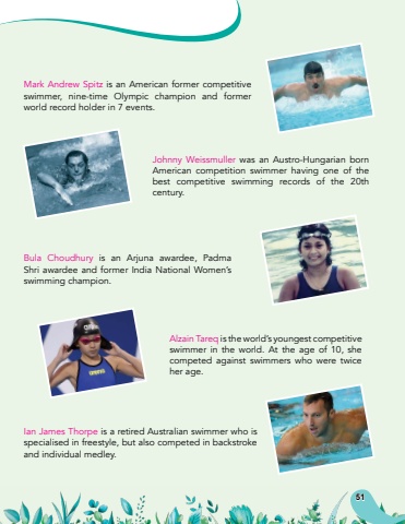 Mark Andrew Spitz is an American former competitive swimmer, nine-time Olympic champion and former world record holder in 7 events.Johnny Weissmuller was an Austro-Hungarian born American competition swimmer having one of the best competitive swimming records of the 20th century.Bula Choudhury is an Arjuna awardee, Padma Shri awardee and former India National Women%u2019s swimming champion.Alzain Tareq is the world%u2019s youngest competitive swimmer in the world. At the age of 10, she competed against swimmers who were twice her age.Ian James Thorpe is a retired Australian swimmer who is specialised in freestyle, but also competed in backstroke and individual medley.51