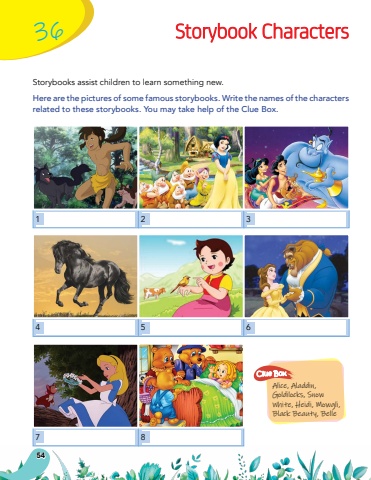 Storybook CharactersStorybooks assist children to learn something new.Here are the pictures of some famous storybooks. Write the names of the characters related to these storybooks. You may take help of the Clue Box.Alice, Aladdin, Goldilocks, Snow White, Heidi, Mowgli, Black Beauty, BelleClue Box147258363654