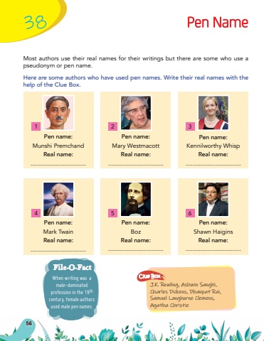 Pen name:Munshi PremchandReal name:.................................Pen name:Mark TwainReal name:.................................Pen name:Mary WestmacottReal name:.................................Pen name:Kennilworthy WhispReal name:.................................Pen name:BozReal name:.................................Pen name:Shawn HaiginsReal name:.................................J.K. Rowling, Ashwin Sanghi, Charles Dickens, Dhanpat Rai, Samuel Langhorne Clemens, Agatha ChristieClue BoxPen NameMost authors use their real names for their writings but there are some who use a pseudonym or pen name.Here are some authors who have used pen names. Write their real names with the help of the Clue Box.14253638When writing was a male-dominated profession in the 19thcentury, female authors used male pen names.File-O-Fact56