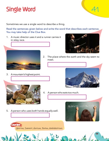 Single WordGlutton, Summit, Horizon, Baton, AmbidextrousClue BoxSometimes we use a single word to describe a thing.Read the sentences given below and write the word that describes each sentence. You may take help of the Clue Box.411.A music director uses it and a runner carries it in relay race.2.The place where the earth and the sky seem to meet.3.A mountain%u2019s highest point.4.A person who eats too much.5.A person who uses both hands equally well.59