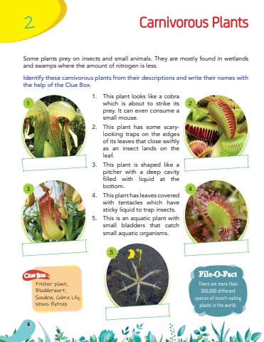 2Some plants prey on insects and small animals. They are mostly found in wetlands and swamps where the amount of nitrogen is less.Identify these carnivorous plants from their descriptions and write their names with the help of the Clue Box.1.This plant looks like a cobra which is about to strike its prey. It can even consume a small mouse.2.This plant has some scarylooking traps on the edges of its leaves that close swiftly as an insect lands on the leaf.3.This plant is shaped like a pitcher with a deep cavity filled with liquid at the bottom.4.This plant has leaves covered with tentacles which have sticky liquid to trap insects.5.This is an aquatic plant with small bladders that catch small aquatic organisms.There are more than 300,000 different species of insect-eating plants in the world.File-O-Fact13524Pitcher plant, Bladderwort, Sundew, Cobra Lily, Venus flytrapClue BoxCarnivorous Plants6