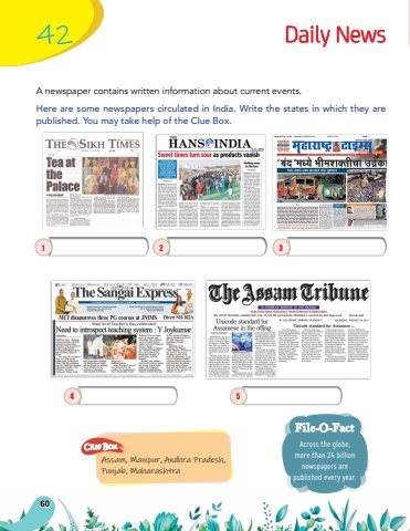 A newspaper contains written information about current events.Here are some newspapers circulated in India. Write the states in which they are published. You may take help of the Clue Box.Assam, Manipur, Andhra Pradesh, Punjab, MaharashtraClue Box42Daily News14235Across the globe, more than 24 billion newspapers are published every year.File-O-Fact60