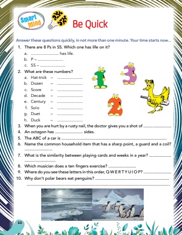 SmartMindBe QuickAnswer these questions quickly, in not more than one minute. Your time starts now...1.There are 8 Ps in SS. Which one has life on it?a......................... has life.b.P %u2013 ......................c.SS %u2013 ......................2.What are these numbers?a.Hat-trick%u2013......................b.Dozen%u2013......................c.Score%u2013......................d.Decade%u2013......................e.Century%u2013......................f.Solo%u2013......................g.Duet%u2013......................h.Duck%u2013......................3.When you are hurt by a rusty nail, the doctor gives you a shot of ........................4.An octagon has ........................ sides.5.The ABC of a car is ...........................................................................................6.Name the common household item that has a sharp point, a guard and a coil? ........................7.What is the similarity between playing cards and weeks in a year? ..............................................8.Which musician does a ten fingers exercise? ........................9.Where do you see these letters in this order, Q W E R T Y U I O P? ........................10.Why don%u2019t polar bears eat penguins? ............................................................................................................................................................................................68