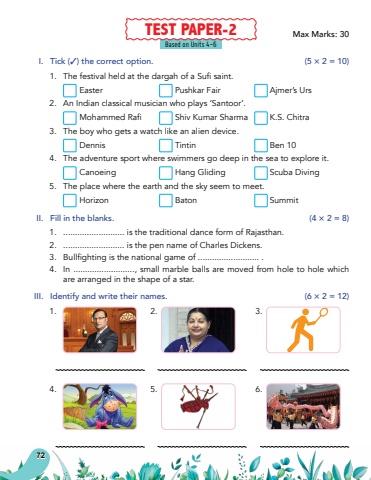 72Based on Units 4-6TEST PAPER-2Max Marks: 30I.Tick (%uf033) the correct option.(5 %u00d7 2 = 10)1.The festival held at the dargah of a Sufi saint.EasterPushkar FairAjmer%u2019s Urs2.An Indian classical musician who plays %u2018Santoor%u2019.Mohammed RafiShiv Kumar SharmaK.S. Chitra3.The boy who gets a watch like an alien device.DennisTintinBen 104.The adventure sport where swimmers go deep in the sea to explore it.CanoeingHang GlidingScuba Diving5.The place where the earth and the sky seem to meet.HorizonBatonSummitII.Fill in the blanks.(4 %u00d7 2 = 8)1........................... is the traditional dance form of Rajasthan.2........................... is the pen name of Charles Dickens.3.Bullfighting is the national game of .......................... .4.In .........................., small marble balls are moved from hole to hole which are arranged in the shape of a star.III.Identify and write their names.(6 %u00d7 2 = 12)1.2.3.4.5.6.