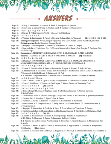Page 5:1.Curry 2. Coriander 3. Lettuce 4. Basil 5. Fenugreek 6. SpinachPage 6:1.Cobra Lily 2. Venus flytrap 3. Pitcher plant 4. Sundew 5. BladderwortPage 7:1.d, e 2. g, i 3. a, j 4. b, f 5. c, hPage 8:1.Skunk 2. Frilled lizard 3. Turtle 4. Looper 5. Polar bearPage 9:1.e 2. d 3. a 4. c 5. bPage 10:1. Volcano 2. Earthquake 3. Flood 4. Drought 5. Landslide 6. Tsunami%u2003%u2003QQ: 1. 102 2. 101 3. 100Page 11:Endangered species: Whale, Bengal Tiger, Bald Ibis, Giant Panda, Crane, Blackbuck, CheetahExtinct species: Dodo, Dinosaur, Quagga, Quail,Page 16:1.Hooghly 2. Brahmaputra 3. Yamuna 4. Sabarmati 5. Gomti 6. GangesPage 17:1.Mysore Palace 2. Jaisalmer Fort 3. Victoria Memorial 4. Konark Sun Temple 5. Fatehpur Sikri 6. Sanchi StupaPage 18:Mountains: 1. MCKINLEY 2. HIMALAYAS 3. FUJI 4. KILIMANJARO 5. ALPS 6. URALSDeserts: 1. SAHARA 2. GOBI 3. THAR 4. KALAHARI 5. TANAMI%u2003%u2003QQ: HimalayasPage 19:1.f 2. d 3. e 4. c 5. a 6. bPage 20:1.RAJA RAM MOHAN ROY, b 2. SIR SYED AHMAD KHAN, c 3. DAYANAND SARASWATI, a 4. RAMAKRISHNA PARAMAHANSA, e 5. ISHWAR CHANDRA VIDYASAGAR, dPage 21:1.d 2. f 3. a 4. g 5. c 6. b 7. ePage 22:1.France 2. Saudi Arabia 3. Spain 4. Indonesia 5. Japan 6. Hawaii 7. Italy 8. ChinaPage 23:I.1.Bladderwort 2. Stonefish 3. Raja Ram Mohan Roy 4. Bartolomeu Dias 5. Africa 6. Mountains 7. Fenugreek 8. Frilled lizard 9. Sabarmati 10. FujiII. 1. Sundew 2. Mysore Palace 3. Merlion Park 4. Petronas Towers 5. Looper 6. OysterPage 26:1.c 2. f 3. a 4. d 5. b 6. ePage 27:1.Save 2. Print 3. New 4. Open 5. Copy 6. Recycle bin 7. Download 8. Folder 9. PastePage 28:1.Crane 2. Bulldozer 3. Tractor 4. Fire Engine 5. Water Tanker 6. Tow-away TruckPage 29:1.b 2. c 3. a 4. e 5. d%u2003%u2003QQ: SputnikPage 30:1.b 2. e 3. i 4. c 5. a 6. d 7. g 8. f 9. hPage 31:1.Homi Jehangir Bhabha 2. Meghnad Saha 3. G.N. Ramachandran 4. Vikram Sarabhai 5. Birbal SahniPage 34:1.Leonardo da Vinci 2. Vincent van Gogh 3. Raja Ravi Varma 4. M. F. Husain 5. Johannes VermeerPage 35:1.Pushkar Fair 2. Carnival 3. Ajmer%u2019s Urs 4. EasterPage 36:1.Manipuri 2. Garba 3. Sattriya 4. Ghoomar 5. Kaikottikali 6. NautankiPage 37:1.Ghatu dance, e 2. Dragon dance, a 3. Belly dance, c 4. Kabuki dance, f 5. Tarantella dance, b 6. Tango dance, dPage 38:1.Bagpipes 2. Accordion 3. Cymbals 4. Harp 5. French Horn 6. Trombone 7. CongoPage 39:1.M.S. Subbulakshmi 2. Bhimsen Joshi 3. Shiv Kumar Sharma 4. K.S. Chitra 5. Mohammed RafiPage 40:1.e 2. c 3. d 4. a 5. b%u2003%u2003QQ: KiltPage 41:I.1.Tooth 2. Aviation fuel 3. Saturn 4. Homi Jehangir Bhabha 5. Pushkar Fair 6. K.S. Chitra 7. Ghoomar 8. Easter 9. Leonardo da Vinci 10. GetaII.1.Recycle bin 2. Girl with a Pearl Earring 3. Accordion 4. Tarantella dance 5. Mohammed Rafi 6. ApolloPage 44:1.Australia 2. Brazil 3. Spain 4. USA 5. New Zealand 6. Afghanistan 7. Scotland 8. Bangladesh 9. Sri Lanka%u2003%u2003QQ: 6 timesPage 45:1.Carrom, c 2. Snakes and Ladders, d 3. Bagatelle, f 4. Chess, b 5. Chinese Checkers, e 6. Scrabble, aAnswersAnswers