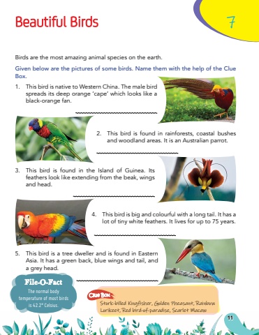 1.This bird is native to Western China. The male bird spreads its deep orange %u2018cape%u2019 which looks like a black-orange fan.2.This bird is found in rainforests, coastal bushes and woodland areas. It is an Australian parrot.3.This bird is found in the Island of Guinea. Its feathers look like extending from the beak, wings and head.4.This bird is big and colourful with a long tail. It has a lot of tiny white feathers. It lives for up to 75 years.5.This bird is a tree dweller and is found in Eastern Asia. It has a green back, blue wings and tail, and a grey head. Beautiful Birds7Birds are the most amazing animal species on the earth.Given below are the pictures of some birds. Name them with the help of the Clue Box.The normal body temperature of most birds is 42.2%u00b0 Celsius.File-O-FactStork-billed Kingfisher, Golden Pheasant, Rainbow Lorikeet, Red bird-of-paradise, Scarlet MacawClue Box11