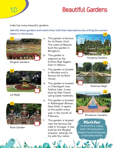 10Beautiful Gardensa.This garden is famous for its flower clock. The rulers of Mysore built this garden in Bengaluru.b.This garden is adjacent to the Krishna Raja Sagara Dam in Mysuru.c.This garden is located in Mumbai and is famous for its Boot House. d.This garden is located in Chandigarh near Sukhna Lake. It was built by Nek Chand using waste materials. e.This garden is located in Rashtrapati Bhavan, New Delhi. It opens to the public every year in the month of February. f.This garden is located near the famous Dal Lake in Srinagar. It was built by the Mughal emperor Jahangir for his wife Nur Jahan. The Alfred Park or Company Garden is the largest garden in Allahabad. It has been officially named as Chandrashekhar Azad Park. File-O-FactIndia has many beautiful gardens.Identify these gardens and match them with their descriptions by writing the correct letters in the boxes.Lal BaghMughal GardensRock GardenShalimar BaghHanging GardensBrindavan Gardens24613518