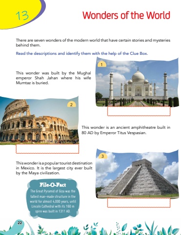 Wonders of the WorldThis wonder was built by the Mughal emperor Shah Jahan where his wife Mumtaz is buried.This wonder is an ancient amphitheatre built in 80 AD by Emperor Titus Vespasian.This wonder is a popular tourist destination in Mexico. It is the largest city ever built by the Maya civilization.13There are seven wonders of the modern world that have certain stories and mysteries behind them.Read the descriptions and identify them with the help of the Clue Box.The Great Pyramid of Giza was the tallest man-made structure in the world for almost 4,000 years, until Lincoln Cathedral with its 160 m spire was built in 1311 AD.File-O-Fact12322