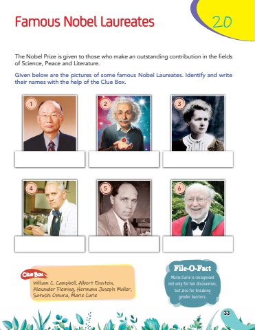 Famous Nobel Laureates20Marie Curie is recognised not only for her discoveries, but also for breaking gender barriers.File-O-FactThe Nobel Prize is given to those who make an outstanding contribution in the fields of Science, Peace and Literature.Given below are the pictures of some famous Nobel Laureates. Identify and write their names with the help of the Clue Box.William C. Campbell, Albert Einstein, Alexander Fleming, Hermann Joseph Muller, Satoshi Omura, Marie CurieClue Box14253633