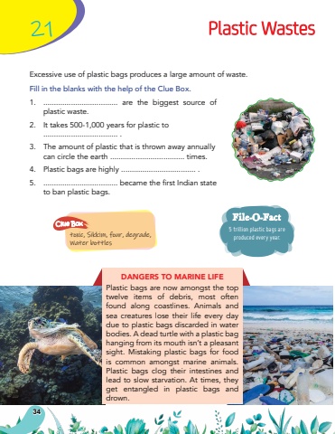 Plastic WastesDANGERS TO MARINE LIFEPlastic bags are now amongst the top twelve items of debris, most often found along coastlines. Animals and sea creatures lose their life every day due to plastic bags discarded in water bodies. A dead turtle with a plastic bag hanging from its mouth isn%u2019t a pleasant sight. Mistaking plastic bags for food is common amongst marine animals. Plastic bags clog their intestines and lead to slow starvation. At times, they get entangled in plastic bags and drown.Excessive use of plastic bags produces a large amount of waste.Fill in the blanks with the help of the Clue Box.1.................................... are the biggest source of plastic waste.2.It takes 500-1,000 years for plastic to ................................... .3.The amount of plastic that is thrown away annually can circle the earth ................................... times.4.Plastic bags are highly ................................... .5.................................... became the first Indian state to ban plastic bags.215 trillion plastic bags are produced every year.File-O-Facttoxic, Sikkim, four, degrade, Water bottlesClue Box34