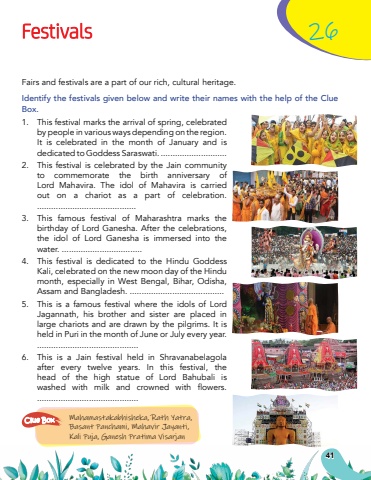 Festivals261.This festival marks the arrival of spring, celebrated by people in various ways depending on the region. It is celebrated in the month of January and is dedicated to Goddess Saraswati. ............................2.This festival is celebrated by the Jain community to commemorate the birth anniversary of Lord Mahavira. The idol of Mahavira is carried out on a chariot as a part of celebration. ..........................................3.This famous festival of Maharashtra marks the birthday of Lord Ganesha. After the celebrations, the idol of Lord Ganesha is immersed into the water. ..................................4.This festival is dedicated to the Hindu Goddess Kali, celebrated on the new moon day of the Hindu month, especially in West Bengal, Bihar, Odisha, Assam and Bangladesh. ........................................5.This is a famous festival where the idols of Lord Jagannath, his brother and sister are placed in large chariots and are drawn by the pilgrims. It is held in Puri in the month of June or July every year. ...........................................6.This is a Jain festival held in Shravanabelagola after every twelve years. In this festival, the head of the high statue of Lord Bahubali is washed with milk and crowned with flowers. ...........................................Fairs and festivals are a part of our rich, cultural heritage.Identify the festivals given below and write their names with the help of the Clue Box.Mahamastakabhisheka, Rath Yatra, Basant Panchami, Mahavir Jayanti, Kali Puja, Ganesh Pratima VisarjanClue Box41