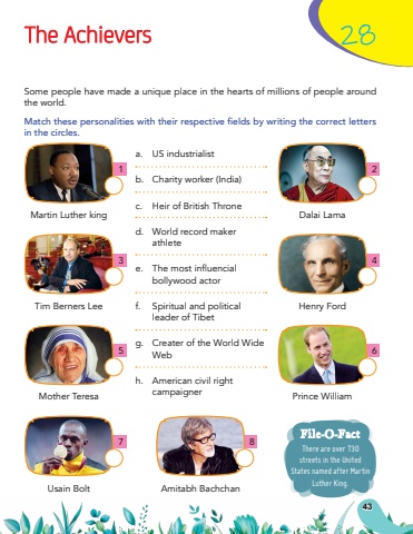 13572468There are over 730 streets in the United States named after Martin Luther King.File-O-Fact28a.US industrialistb.Charity worker (India)c.Heir of British Throned.World record maker athletee.The most influencial bollywood actorf.Spiritual and political leader of Tibetg.Creater of the World Wide Webh.American civil right campaignerThe AchieversSome people have made a unique place in the hearts of millions of people around the world.Match these personalities with their respective fields by writing the correct letters in the circles.Martin Luther kingTim Berners LeeMother TeresaUsain Bolt Amitabh BachchanDalai LamaHenry FordPrince William43