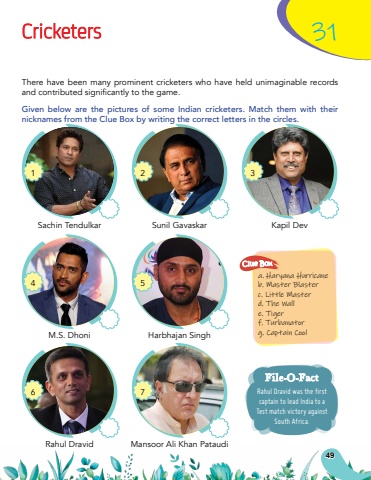 CricketersThere have been many prominent cricketers who have held unimaginable records and contributed significantly to the game.Given below are the pictures of some Indian cricketers. Match them with their nicknames from the Clue Box by writing the correct letters in the circles.31Rahul Dravid was the first captain to lead India to a Test match victory against South Africa.File-O-Facta. Haryana Hurricaneb. Master Blasterc. Little Masterd. The Walle. Tigerf. Turbanatorg. Captain CoolClue Box6417523Sachin TendulkarM.S. DhoniRahul DravidSunil GavaskarHarbhajan SinghMansoor Ali Khan PataudiKapil Dev49