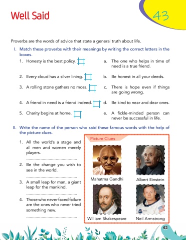 Picture CluesProverbs are the words of advice that state a general truth about life.I.Match these proverbs with their meanings by writing the correct letters in the boxes.1.Honesty is the best policy.a.The one who helps in time of need is a true friend.2.Every cloud has a silver lining.b.Be honest in all your deeds.3.A rolling stone gathers no moss.c.There is hope even if things are going wrong.4.A friend in need is a friend indeed.d.Be kind to near and dear ones.5.Charity begins at home.e.A fickle-minded person can never be successful in life.II.Write the name of the person who said these famous words with the help of the picture clues.Well Said431.All the world%u2019s a stage and all men and women merely players............................................2.Be the change you wish to see in the world............................................3.A small leap for man, a giant leap for the mankind............................................4.Those who never faced failure are the ones who never tried something new............................................Mahatma GandhiAlbert EinsteinWilliam ShakespeareNeil Armstrong63