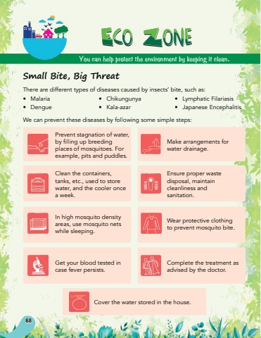 You can help protect the environment by keeping it clean. Small Bite, Big ThreatThere are different types of diseases caused by insects%u2019 bite, such as:We can prevent these diseases by following some simple steps:%u2022Malaria%u2022Dengue%u2022Chikungunya%u2022Kala-azar%u2022Lymphatic Filariasis%u2022Japanese EncephalitisPrevent stagnation of water, by filling up breeding places of mosquitoes. For example, pits and puddles.Clean the containers, tanks, etc., used to store water, and the cooler once a week.In high mosquito density areas, use mosquito nets while sleeping.Get your blood tested in case fever persists.Cover the water stored in the house.Wear protective clothing to prevent mosquito bite.Complete the treatment as advised by the doctor.Make arrangements for water drainage.Ensure proper waste disposal, maintain cleanliness and sanitation.68
