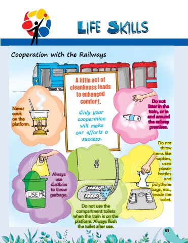 A little act of cleanliness leads to enhanced comfort.Only your cooperation will make our efforts a success.Cooperation with the RailwaysNever cook on the platform.Do not litter in the train, or in and around the railway premises.Always use dustbins to throw garbage.Do not use the compartment toilets when the train is on the platform. Always flush the toilet after use.Do not throw items like napkins, used plastic bottles and polythene bags, etc., inside the toilet.69
