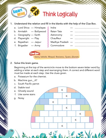 SmartMind1.Understand the relation and fill in the blanks with the help of the Clue Box.a.Lord Shiva%u2014HimalayasIndra%u2014....................................b.Amitabh%u2014BollywoodRatan Tata%u2014....................................c.Geography%u2014EarthAstronomy%u2014....................................d.Playwright%u2014PlayChauffeur%u2014....................................e.Rajasthan%u2014JaipurMadhya Pradesh%u2014....................................f.Brigadier%u2014ArmyCommodore%u2014....................................Think LogicallyNavy, Vehicle, Bhopal, Business, Space, HeavenClue Box2.Solve this brain game.Beginning at the top of the semicircle move to the bottom seven-letter word by adding a letter at each step and rearranging them. A correct and different word must be made at each step. Use the clues given.a.Potassium for the chemist.b.Machine gun__47c.South Pacific parrotd.Stable toole.Ghostly soundf.Like some stairsg.NoisyKKKKKKK70