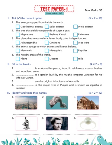 Based on Units 1-3TEST PAPER-1Max Marks: 30I.Tick (3) the correct option.(5 %u00d7 2 = 10)1.The energy trapped from inside the earth.Geothermal energySolar energyWind energy2.The tree that yields two pounds of sugar a year.Maple treeBrahma KamalPalm tree3.The plant that treats malaria, fever, body pain, indigestion, etc.AshwagandhaCinchona Aloe vera4.The animal group to which snakes and lizards belong.MammalsMarsupialsReptiles5.The hot dry areas of the world.PlainsDesertsHillsII.Fill in the blanks.(4 %u00d7 2 = 8)1........................... is an Australian parrot, found in rainforests, coastal bushes and woodland areas.2........................... is a garden built by the Mughal emperor Jahangir for his wife Nur Jahan.3........................... are the original inhabitants of Australia.4........................... is the major river in Punjab and is known as Vipasha in Sanskrit.III.Identify and write their names.(6 %u00d7 2 = 12)1.2.3.4.5.6.75