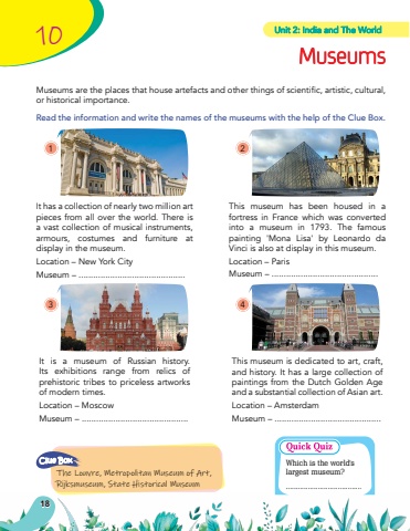 MuseumsMuseums are the places that house artefacts and other things of scientific, artistic, cultural, or historical importance.Read the information and write the names of the museums with the help of the Clue Box.It has a collection of nearly two million art pieces from all over the world. There is a vast collection of musical instruments, armours, costumes and furniture at display in the museum.Location %u2013 New York CityMuseum %u2013 ............................................This museum is dedicated to art, craft, and history. It has a large collection of paintings from the Dutch Golden Age and a substantial collection of Asian art. Location %u2013 AmsterdamMuseum %u2013 ............................................The Louvre, Metropolitan Museum of Art, Rijksmuseum, State Historical MuseumClue BoxThis museum has been housed in a fortress in France which was converted into a museum in 1793. The famous painting 'Mona Lisa' by Leonardo da Vinci is also at display in this museum. Location %u2013 ParisMuseum %u2013 ............................................It is a museum of Russian history. Its exhibitions range from relics of prehistoric tribes to priceless artworks of modern times. Location %u2013 MoscowMuseum %u2013 ............................................10Unit 2: India and The World1324Which is the world's largest museum?......................................18