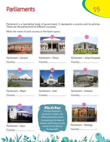15Parliament is a lawmaking body of government. It represents a country and its policies. These are the parliaments of different countries.Write the name of each country in the blank space.Parliament %u2013 SansadCountry ............................Parliament %u2013 MajlisCountry ............................Parliament %u2013 SejmCountry ............................Parliament %u2013 ShoraCountry ............................Parliament %u2013 DietCountry ............................Parliament %u2013 Jatiya SangsadCountry ............................Parliament %u2013 KnessetCountry ............................Parliament %u2013 RiksdagCountry ............................14725368The Indian Parliament is bicameral. It is based on the British parliamentary system. Corresponding to the House of Commons and the House of Lords, we have the Lok Sabha and the Rajya Sabha.File-O-FactParliaments23
